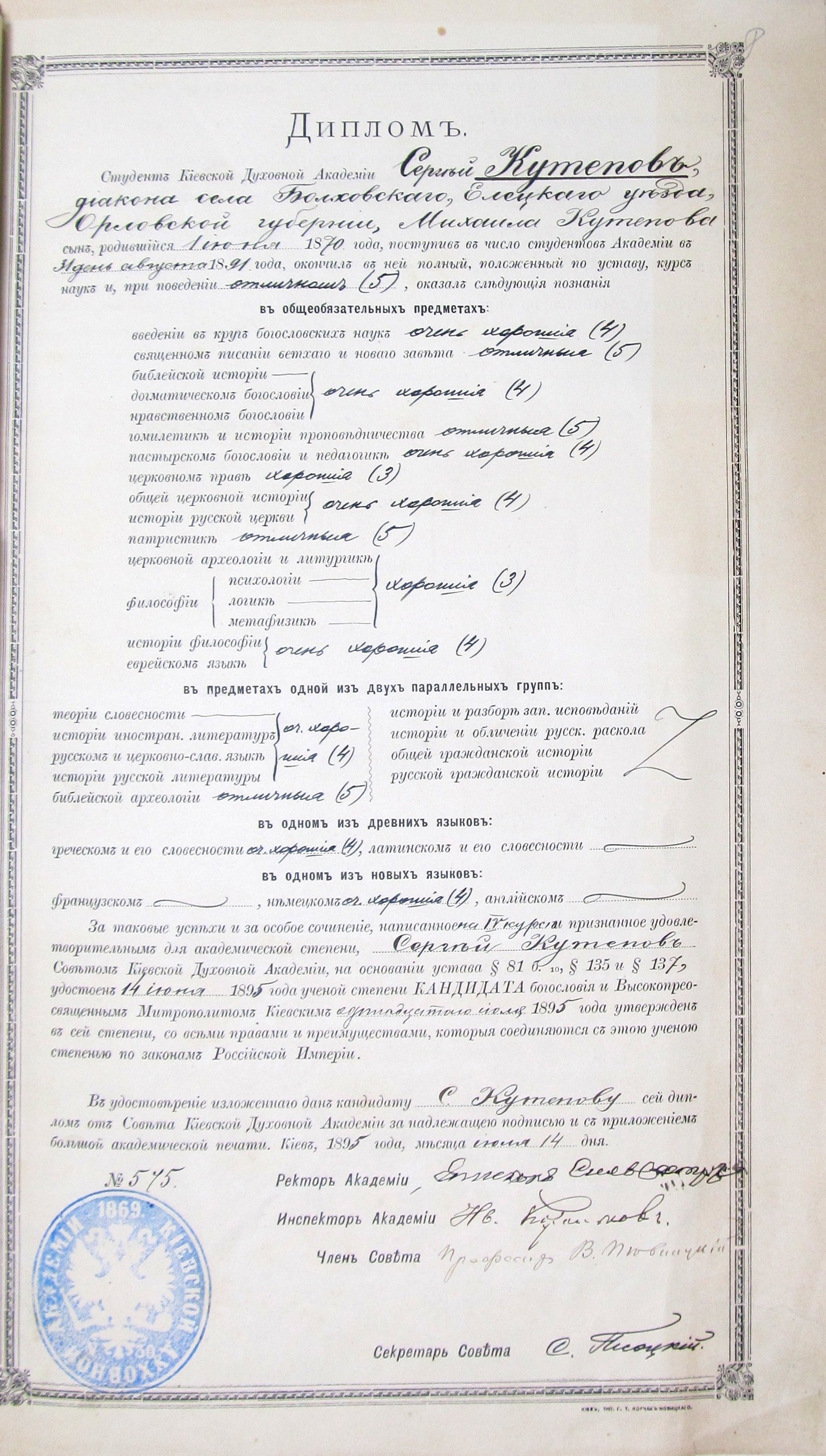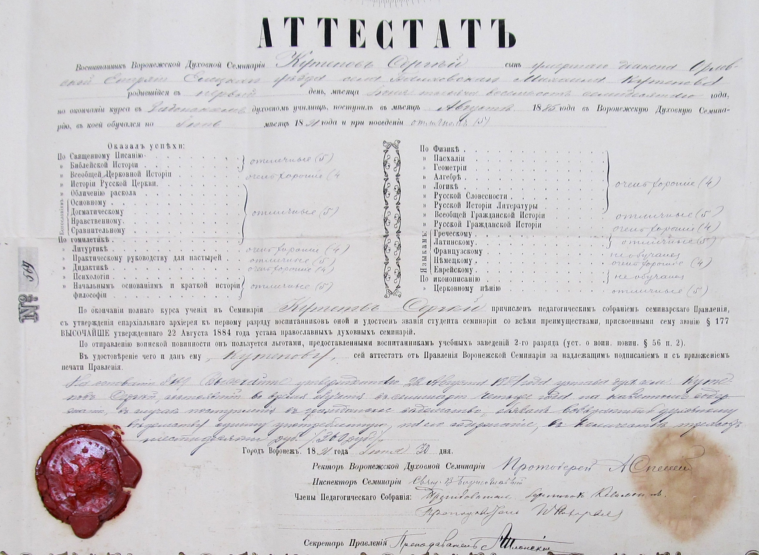 Аттестат о среднем духовном образовании С.М. Кутепова. Воронеж, 1891 г.