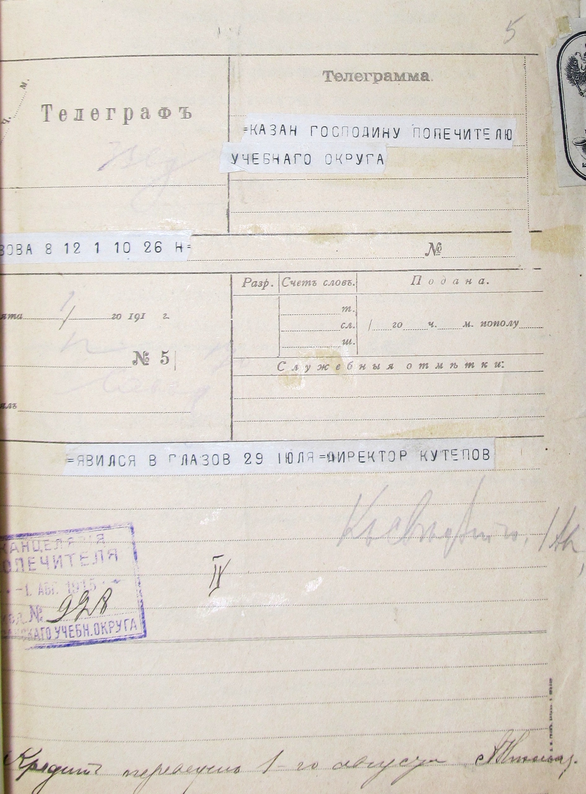 Телеграмма С.М. Кутепова в Казанский учебный округ о прибытии в Глазов. 1915 г. Перед директором стояли три важные задачи: набрать будущих семинаристов, утвердить преподавателей и подыскать помещение для учебных занятий.