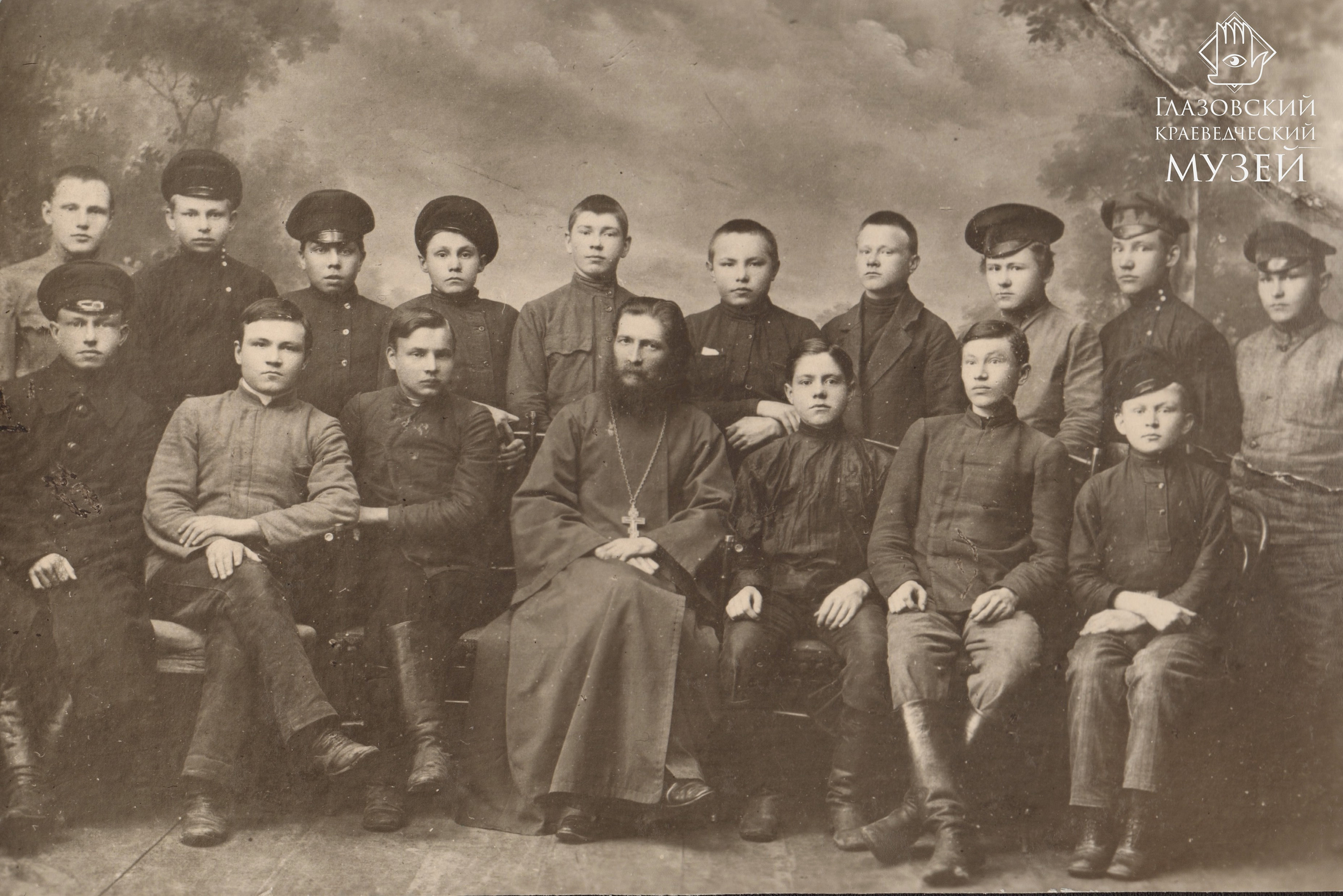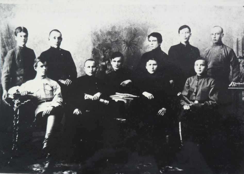 Семинаристы с наставником по удмуртскому языку и председателем Глазовского культурно-просветительного общества «Удмурт» священником В.Д. Крыловым (в центре). Слева направо сидят: первый – Пономарев А., третий – Максимов В., шестой – Опарин Н., стоят: первый – Ившин Д., десятый – Лекомцев К. Глазов, 1917-1918 уч. г. Педагогический коллектив семинарии в год основания состоял из 8 преподавателей. Кроме директора, это – наставник (преподаватель) русского и церковно-славянского языков Т.М. Матвеев, математики – Н.В. Хорошавин, он же вел занятия по рисованию и черчению. Он, впоследствии заслуженный учитель РСФСР (1941 г.), вспоминал: «В организации и оборудовании <семинарии> пришлось мне принять деятельное участие». Историю и географию преподавал Г.М. Боголюбов. Надворный советник (Святого Станислава 3-й степени и Святой Анны 3-й степени) А.П. Петров вел физику, естествоведение и чистописание. Исполняющим обязанности учителя пения и музыки стал М.А. Галавкин. Законоучитель В.А. Татауров одновременно являлся священником Пещерной церкви при Преображенском соборе г. Глазова. Церковь была отведена учащимся и учителям для совершения богослужения. На условиях исполняющего обязанности учителя по физическим упражнениям и играм был принят делопроизводитель местного воинского управления А.Е. Машковцев.
