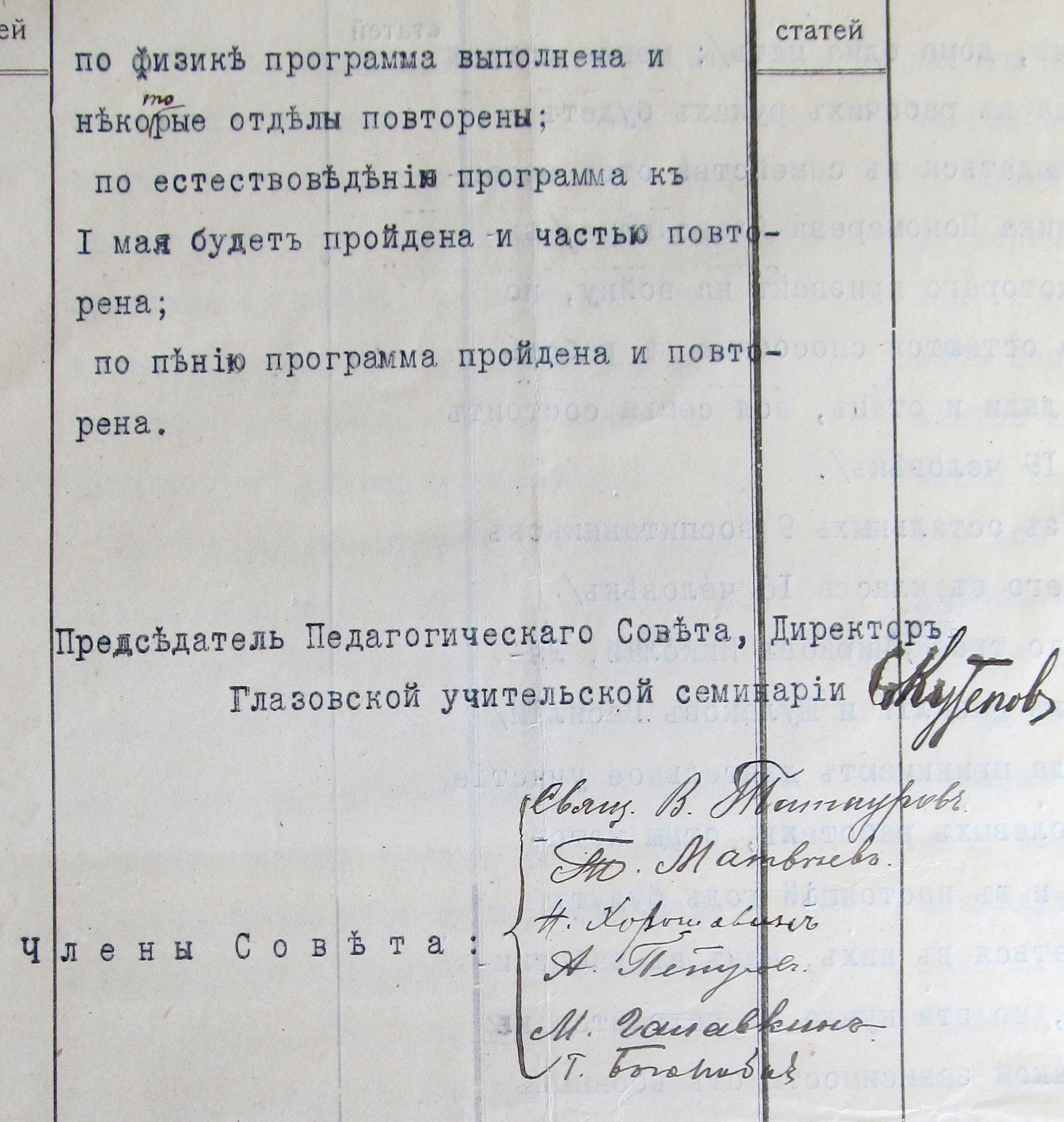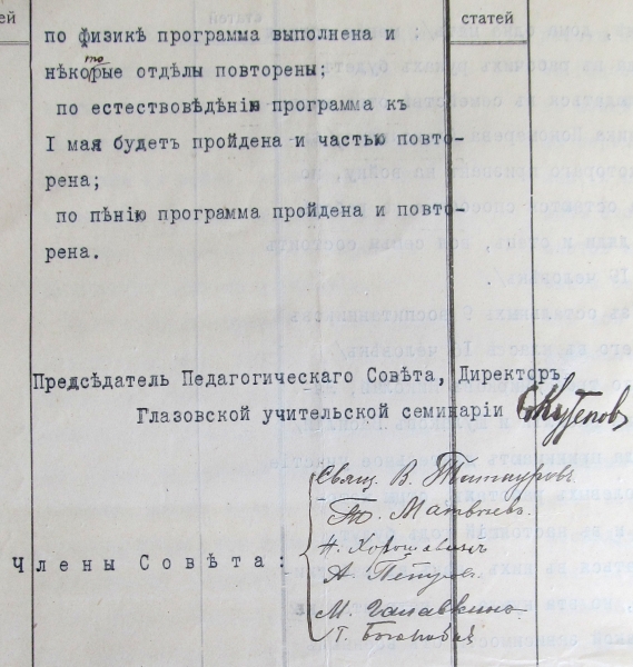 Титульный лист отчета Педагогического совета учительской семинарии. Глазов, 1916 г.Подписи директора и преподавателей семинарии под отчетом Педагогического совета. Глазов, 1916 г.