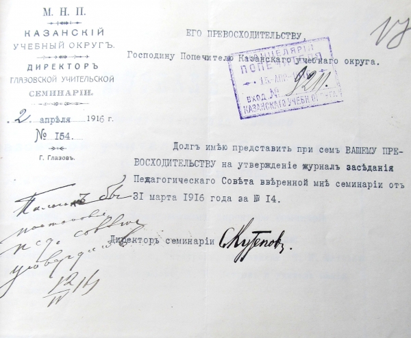 Однако вернемся в 1915 год, когда семья Кутеповых прибыла на новое место жительства. Неясно, каким путем они ехали, все ли одновременно приехали, но можно не сомневаться, что первым их встречал вокзал станции Глазов. Сам директор о прибытии на служебное место отчитался перед попечителем Казанского учебного округа краткой телеграммой: «Явился в Глазов 29 июля».