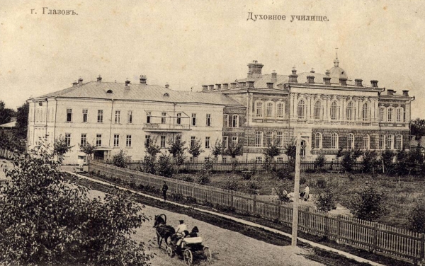 Здание Глазовского духовного училища, переданного в 1921 г. институту народного образования, преемнику учительской семинарии. Глазов, нач. XX в.