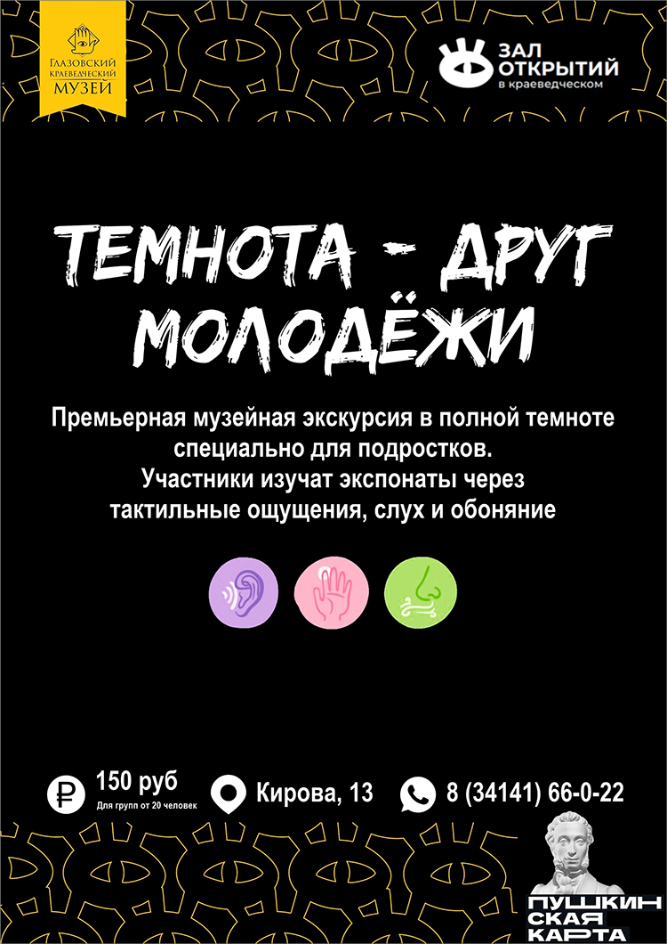 Премьерная музейная экскурсия в полной темноте, специально разработанная для подростков. Участники смогут изучить экспонаты выставки, используя лишь тактильные ощущения, слух и обоняние.